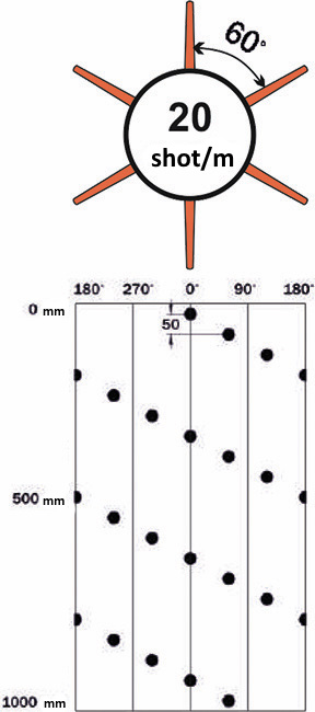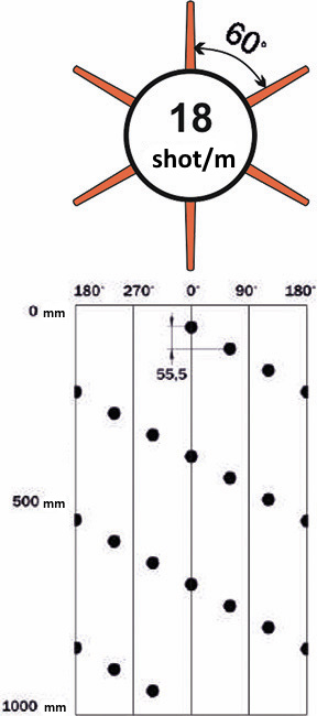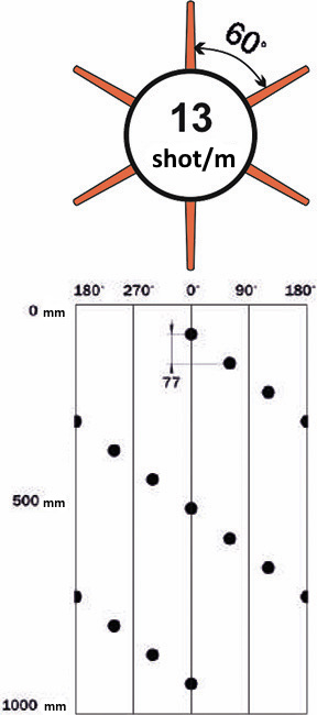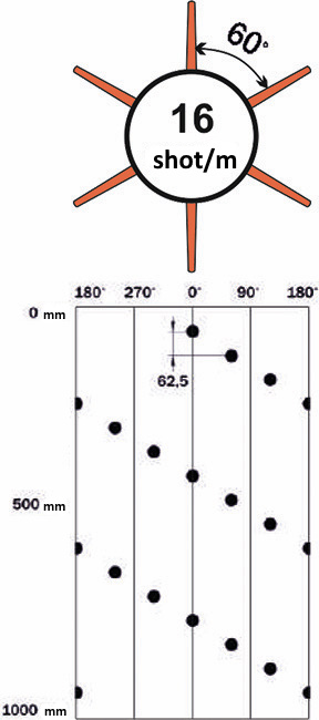 | Shaped charge name | Charge type | Total weight of explosives per charge, g1) | Perforation density, shot/m/phasing, degree. | Average parameters of charge penetrating force, mm | |||