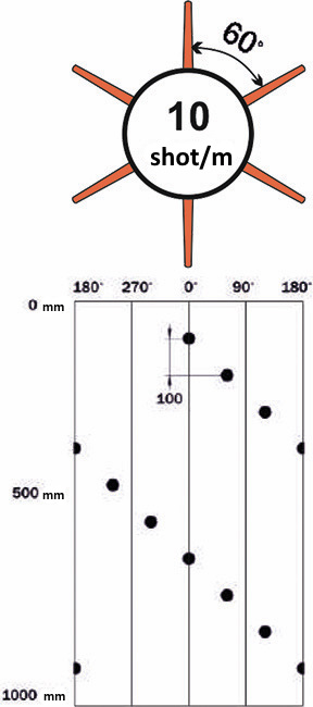 | Gun name | Charge type | Explosive weight per charge, g | Shot density, shot/m/ phasing, degree | Average parameters of charge penetrating force, mm | ||||||